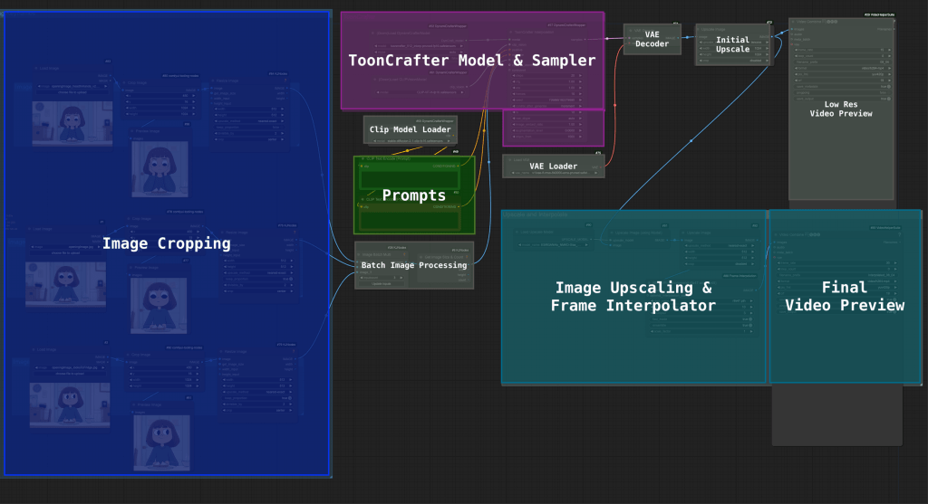 - Image Cropping: Before loading the entire frame we need to crop the image to our area of interest and normalize all the resolutions. ToonCrafter only intakes and outputs low-resolution videos so important we first crop to a specific location so we’re not down scaling our entire frame.
