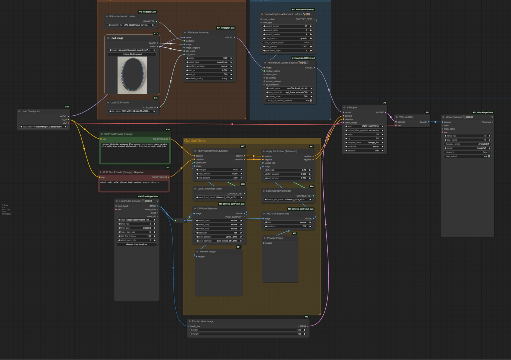 Above is a simplified diagram, and below is a full image of the workflow. Note that the ControlNet for line art has been bypassed; this ControlNet will only be useful if your original video matches the elements of your character. For example, if you cosplayed as your character, the line art ControlNet would be useful because it matches your lines with the character’s lines. In this case, however, it is useless and would make things too similar to the reference image rather than our target character.